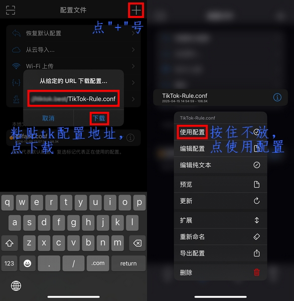 打开Shadowrocket - 配置 - 点右上 + 号,将下面tk配置地址粘贴进去