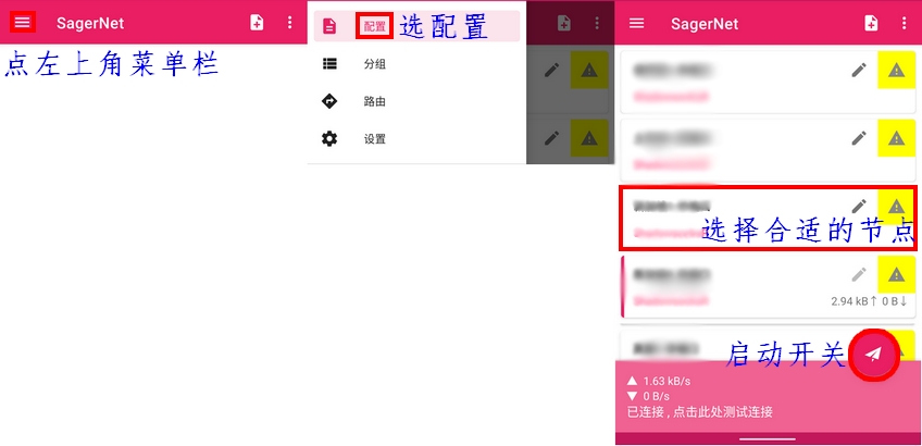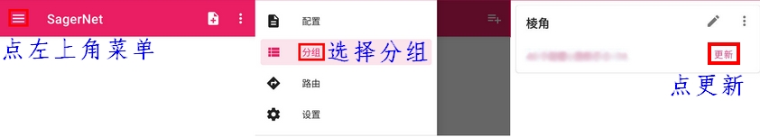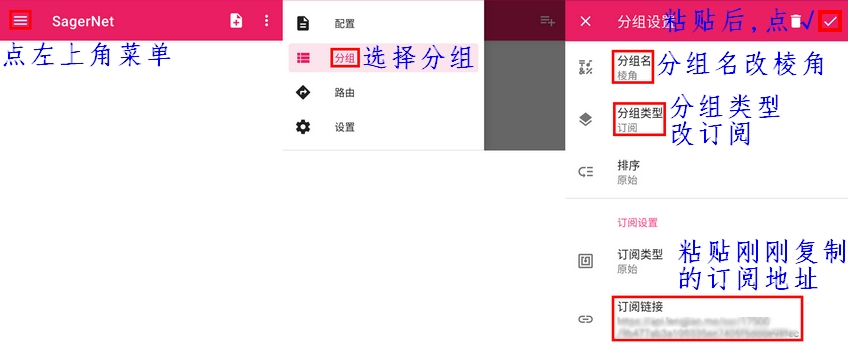 2.打开APP,再点下软件左上角,然后按下面图示方法粘贴订阅地址
