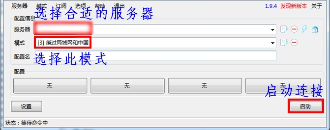 3. 选择合适的服务器及绕过局域网和中国模式,启动连接